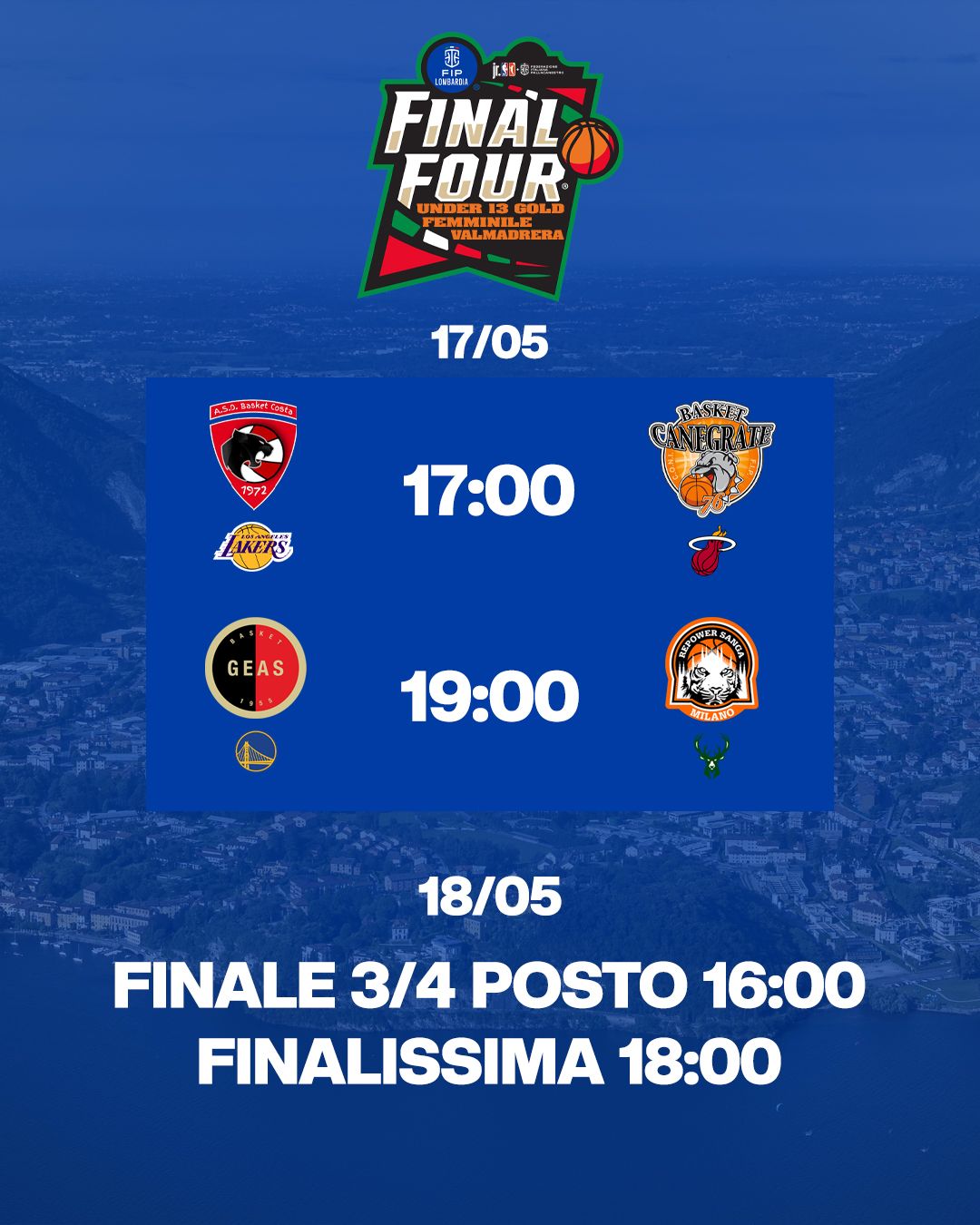 Primo match in programma quello delle 17 di sabato fra i Los Angeles Lakers Elettrica Rogeno Basket Costa e I Miami Heat Basket Canegrate. Alle 19 seconda semifinale fra Golden State Warriors Geas Basket Academy e i Milwaukee Bucks San Gabriele Milano.