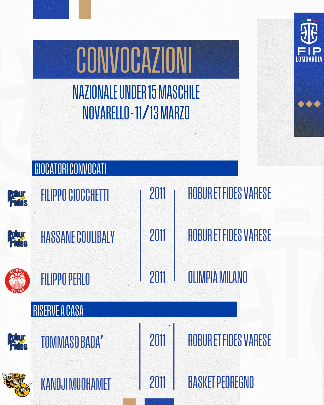 Tre atleti lombardi convocati dal c.t. Alessandro Nocera per la Nazionale Under 15 maschile. Filippo Ciocchetti ed Hassane Coulibaly della Robur et Fides Varese e Filippo Perlo dell’Olimpia Milano fanno parte del gruppo dei 18 convocati per il raduno in programma dall’11 al 13 marzo a Novarello.